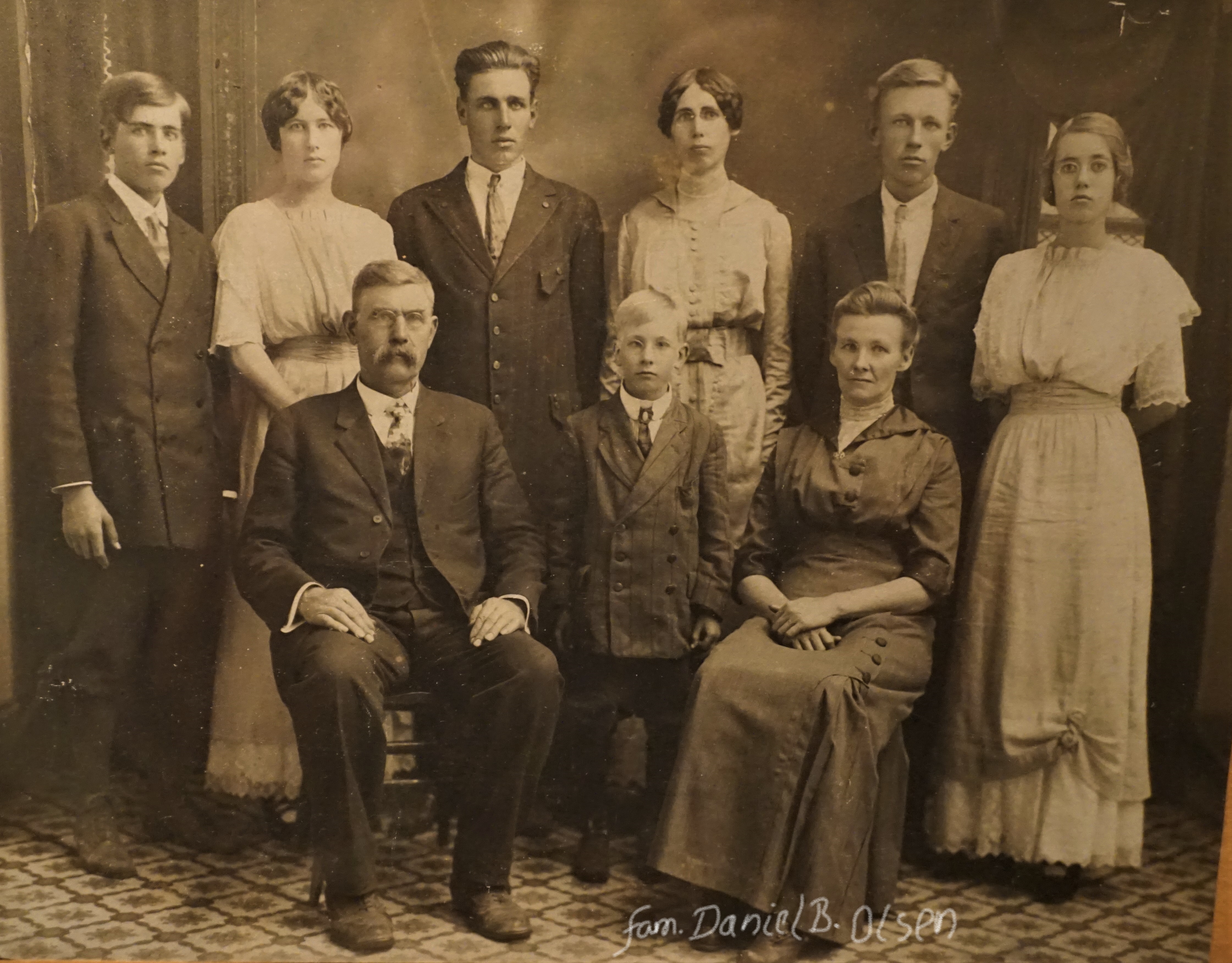 My mother Kristofa Juliannë Årbekk (Larsen) was the daughter of Emerentse Anna Kristine Olsdatter who emigrated to America in 1892 (and went back after 5 years). See the descendants of my grandmother (DFA # 17A) on the Dragland family tree. My mother was VERY concerned with the family in America and often told stories that she had heard from her mother. She had frequent visits by her family from America. When I and my wife visit North Dakota this summer, we hope to find out where my family settled down 127 years ago. Below is a picture of the Daniel B. Olsen Dragland family that my mother had received from America.